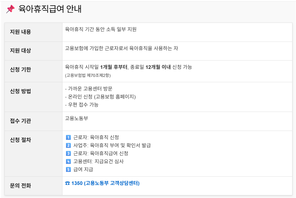 - 고용보험 피보험단위기간 180일 이상: 육아휴직 시작일 이전에 고용보험 가입 기간이 총 180일 이상이어야 합니다.